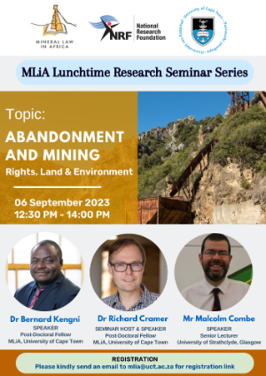 The South African Research Chair: Mineral Law in Africa based at the University of Cape Town is hosting an online Research Seminar on Wednesday 6 September. Our Malcolm Combe is participating in the event, alongside Dr Richard Cramer and Dr Bernard Kengni (who are both Postdoctoral Fellows at the MLiA Chair). This event is part of the MLiA Lunchtime Research Seminar Series. The seminar will consider the right to abandon land in South Africa and Scotland, and associated implications for mining.